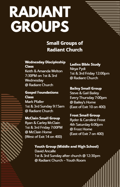 Our goal for small groups is to take people deeper in the Bible, relationships with others, and the mission of God. We currently have a variety of small groups that meet throughout the greater Alpharetta, Johns Creek, Cumming areas, and we hope to start more. We want to see people using their gifts to build up the body of Christ and reach the lost, and a big part of our mission is training and investing people who can do this.